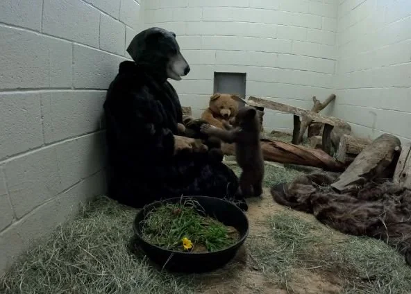So they wore bear masks, oversized fur coats, and leather gloves whenever they interacted with the cub. They also rubbed down their costumes with black-bear-scented hay they picked up from a local sanctuary. The cub needs four feeding sessions every day, along with “enrichment sessions” that mimic maternal behaviors to help prepare the cub for life on the outside.
