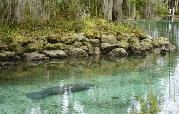 The Florida manatees (Trichechus manatus latirostris), are gentle herbivores that feed mostly on seagrass. The creatures are covered in highly sensitive whiskers called vibrissae, which they use for feeding and navigation.