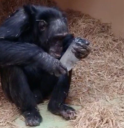 As the New York Times puts it, “the chimps went crystal cuckoo.” In one yard, the chimps repeatedly approached the monolith until the alpha female, Manuela, grabbed it from the pedestal. The troop ignored the sandstone rock, but the crystal never left their sight. A 50-year-old male named Yvan lugged it around while climbing and eating, “passing it between his hands and feet with great panache.”