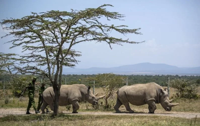The surviving northern white females, Najin, a 34-year-old, and her 23-year-old offspring, Fatu, live in the Ol Pejeta Conservancy in Kenya where they enjoy a 700-acre enclosure and 24-hour armed security guards.